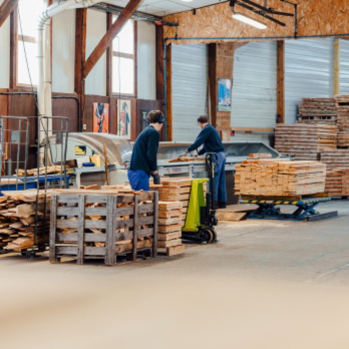Le personnel de l'Esat réalise des projets de menuiserie allant de la conception de palettes, à du mobilier et agencement pour les entreprises. Notre activité de menuiserie réalise aussi l'aménagement intérieur de véhicules utilitaires ou encore des meubles de jardin et autres étagères et comptoirs. Nos fournisseurs garantissent un bois de qualité stocké directement dans notre bâtiment pour assurer une production la plus fluide possible. Nous proposons aussi, en fonction du projet, des travaux d'upcycling de bois en réalisant des meubles à partir d'anciennes huisseries pour leur redonner une nouvelle fonctionnalité, par exemple, ou des projets de restauration pour prolonger la durabilité de certaines pièces de mobilier.